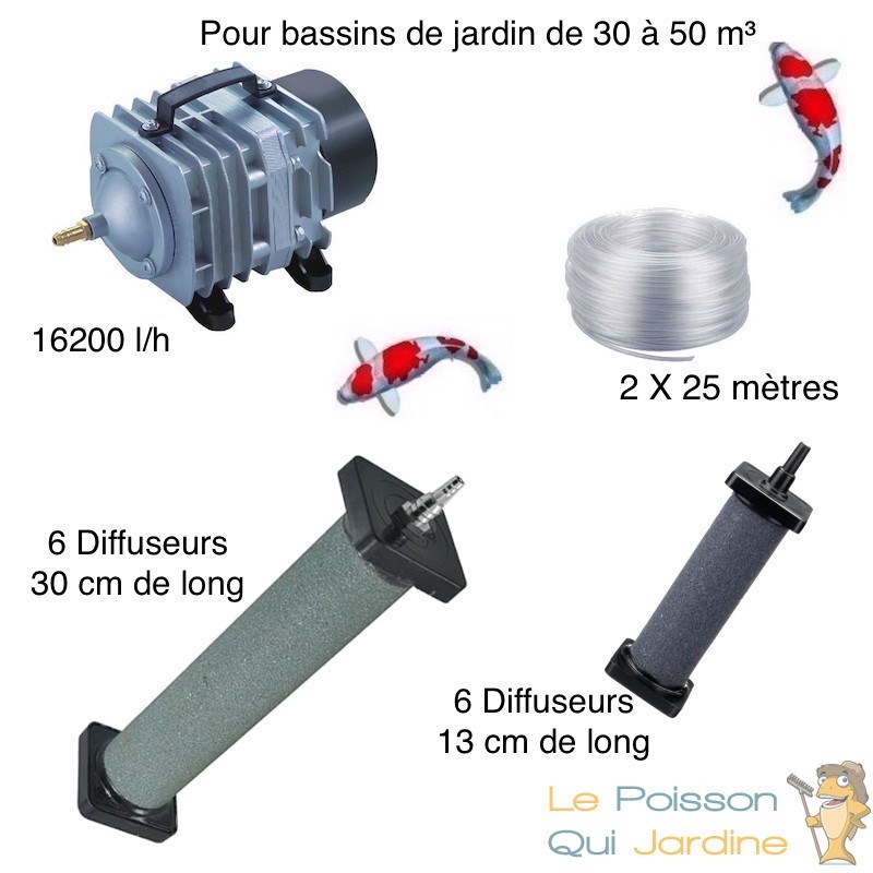 Set d'aération pour bassins de jardin et étangs de 30000 à 50000 litres ( 30 à 50 m³ ). Inclus un compresseur aérateur de bassins de jardin de 16,2 m3/h.