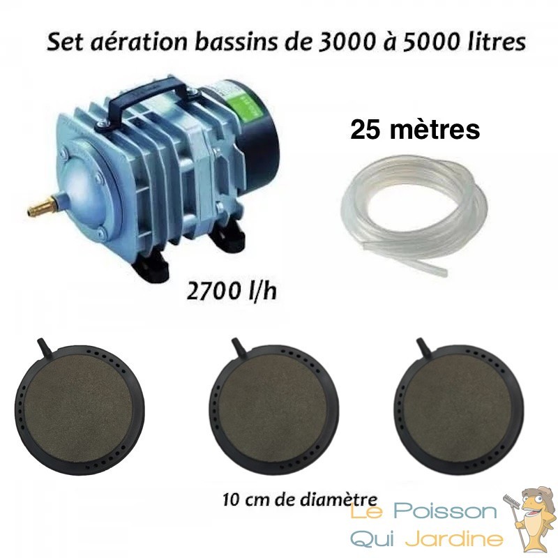 Ce pack comprend le compresseur, le tuyau et les diffuseurs. Tout ce qui est indispensable pour une aération optimale de votre bassin de jardin. Ce set d'aération a été crée par notre entreprise " Le Poisson Qui Jardine ". En effet, nos techniciens ont élaborés des sets d'aération pour chaque client et pour chaque bassin de jardin. Nous avons mixé, composé des articles de qualité et nous avons crée des sets d'aération performant, tout en un et de grande qualité.