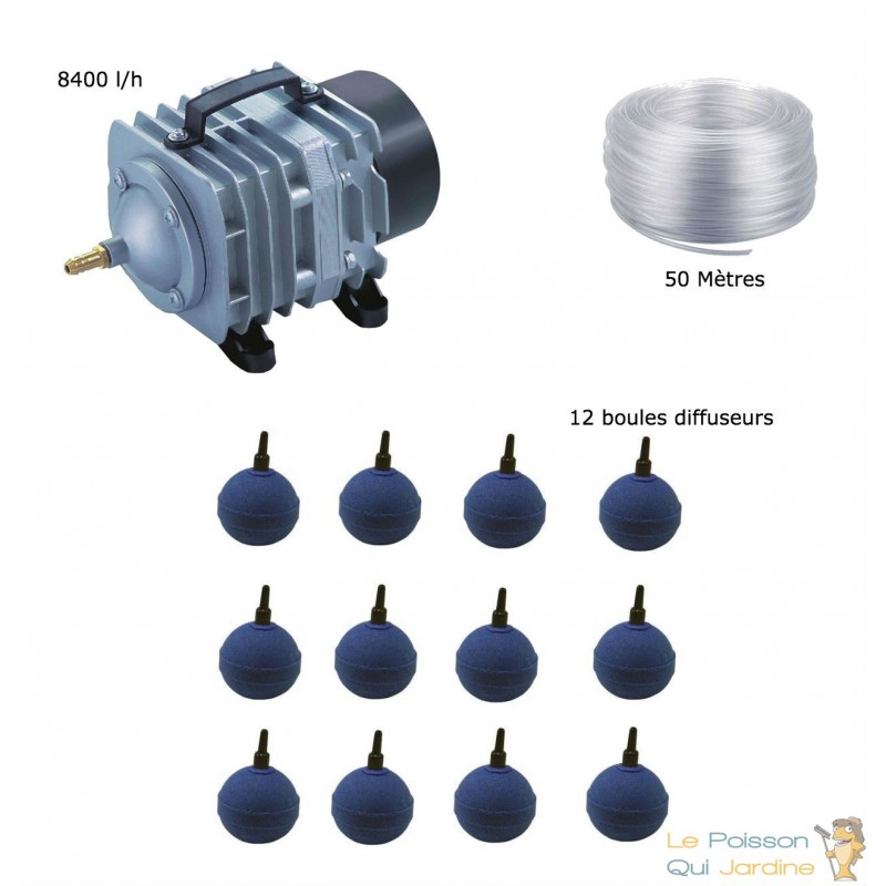 Vous recevrez tout le nécessaire pour installer ce set d'aération. Tout est inclus. Le compresseur de 8400 litres de débit d'air avec son multi-sortie, les 12 boules diffuseurs et le tuyau cristal à air. Vous recevrez aussi une notice d'installation élaborée par nos techniciens et vous pouvez visionner une installation en vidéo. Cette vidéo se trouve en bas de la page.