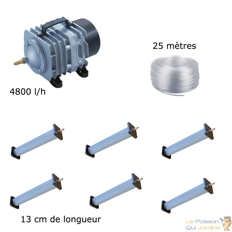 Vous recevrez tout le nécessaire pour installer ce set d'aération. Tout est inclus. Le compresseur avec son multi-sortie, les 6 diffuseurs 13 cm et le tuyau cristal à air.