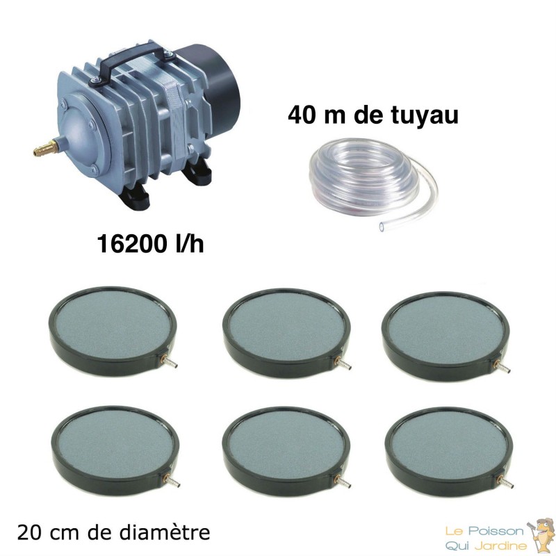 Set d'aération pour bassins de jardin et étangs de 30000 à 50000 litres. Inclus un compresseur aérateur de bassins de jardin de 16,2 m3/h.