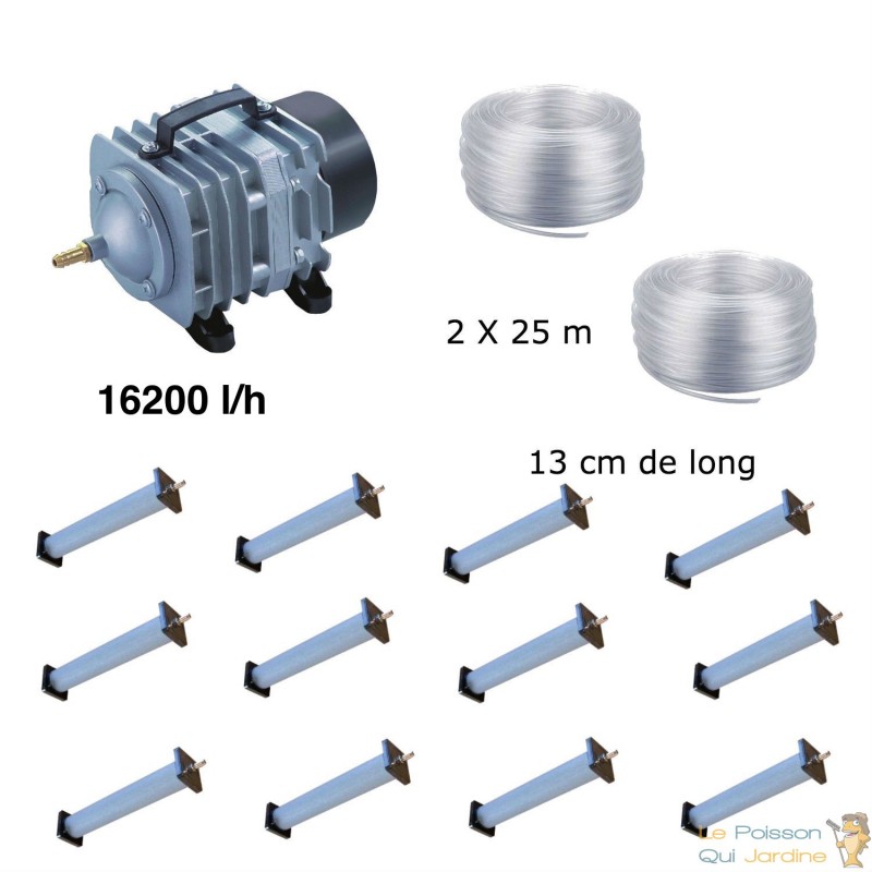 Set d'aération pour bassins de jardin et étangs de 30000 à 50000 litres. Inclus un compresseur aérateur de bassins de jardin de 16,2 m3/h.
