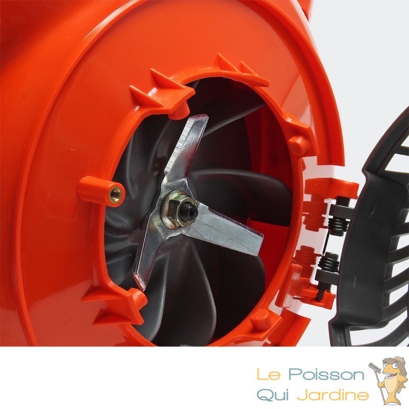 - Doté d'un broyeur qui déchiquette les feuilles qui amène à la réduction de leur volume dans le bac de récupération de 50 litres