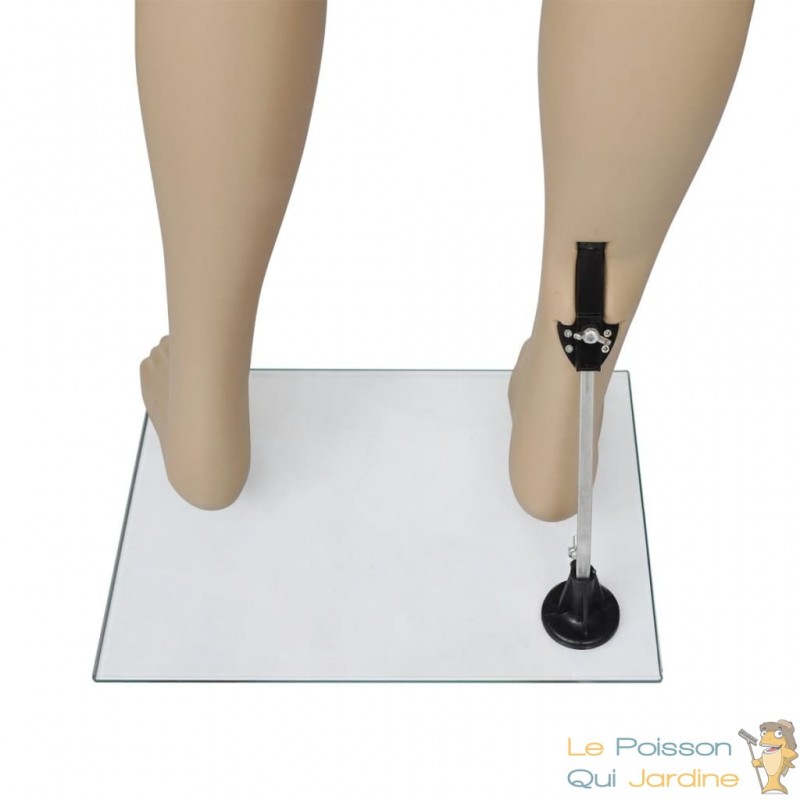 Pour assurer sa stabilité, le mannequin est livré avec une base en verre et est soutenu par un support en aluminium à l'arrière, garantissant une présentation sécurisée et professionnelle des produits.