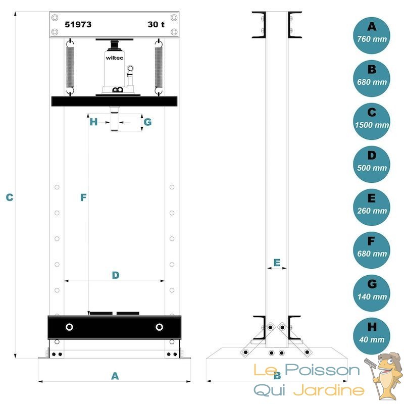 Une presse d'atelier hydraulique est un équipement mécanique conçu pour appliquer une force considérable sur un objet, généralement dans le but de le plier, le presser, le poinçonner, ou l'écraser. Elle se compose généralement des éléments suivants :