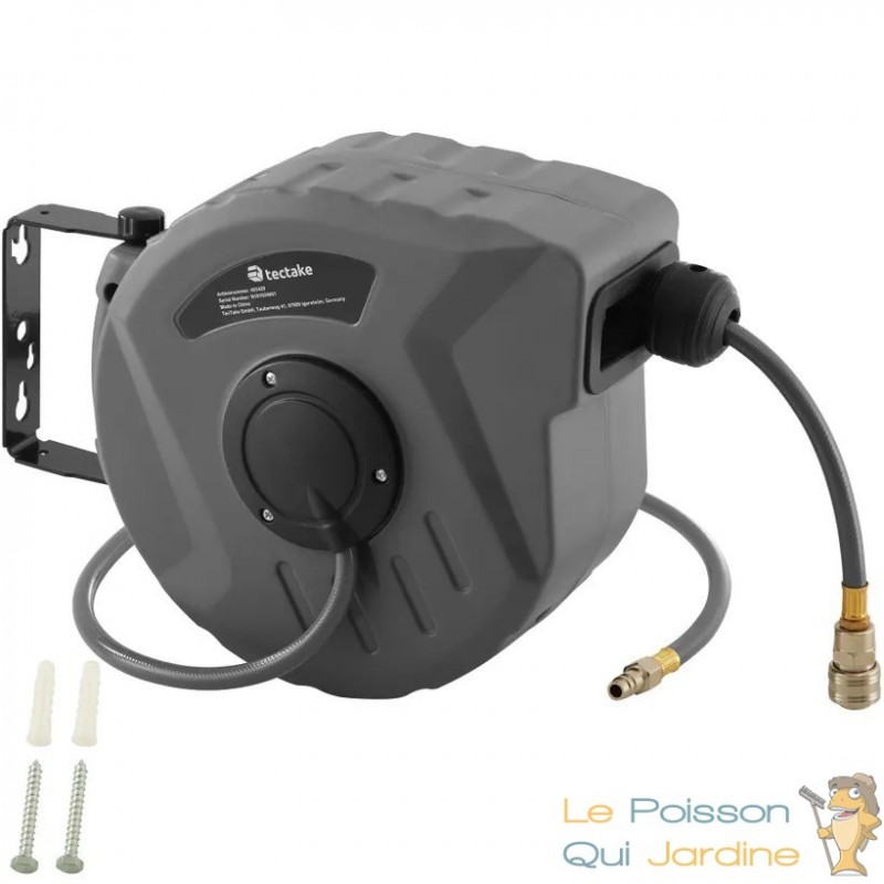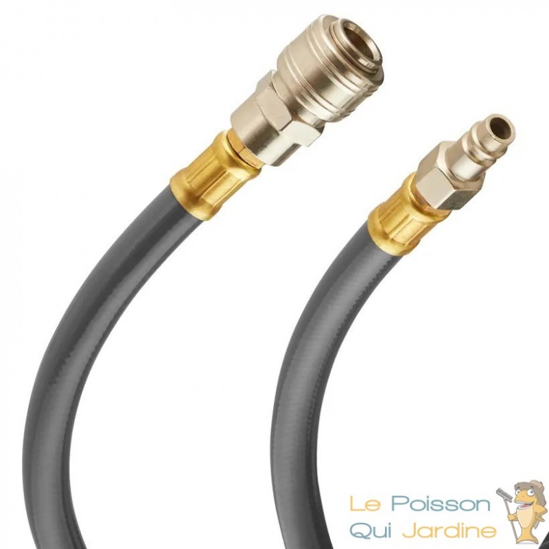 Le tuyau lui-même est équipé d'un raccord rapide, ce qui facilite son installation et son retrait. De plus, il est extensible, ce qui vous permet de l'étendre à la longueur désirée pour atteindre facilement votre zone de travail. Lorsque vous avez terminé, il vous suffit de tirer brièvement sur le tuyau, et il s'enroule automatiquement grâce à un mécanisme intégré.
