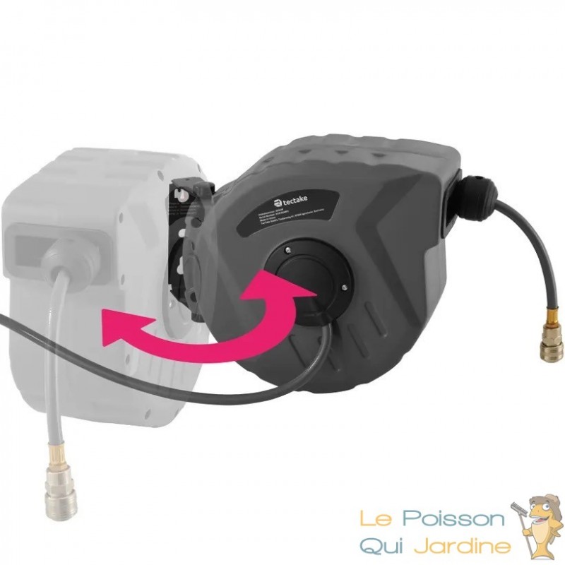L'enrouleur de tuyau est également doté d'un système de rotation, ce qui signifie que la bobine peut pivoter jusqu'à 180 degrés. Cela permet d'éviter que le tuyau ne se tordre ou ne s'emmêle pendant son utilisation, garantissant ainsi une utilisation plus fluide et sans accrocs.