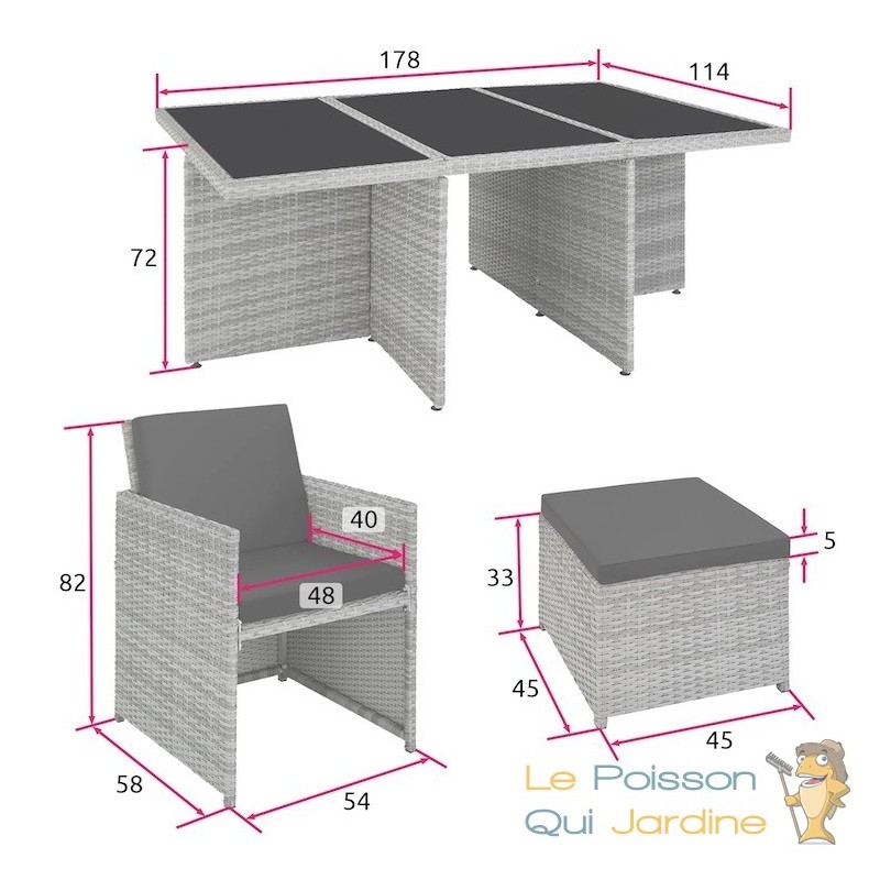 Créez un espace convivial pour les grandes familles avec notre salon de jardin encastrable. Son design contemporain et son assise confortable en font le choix idéal pour partager un repas ou se détendre en extérieur. Grâce à sa polyvalence, il convient aussi bien pour l'extérieur, tel que le jardin, la terrasse ou le balcon, que pour l'intérieur, comme une véranda, un jardin d'hiver ou un salon.