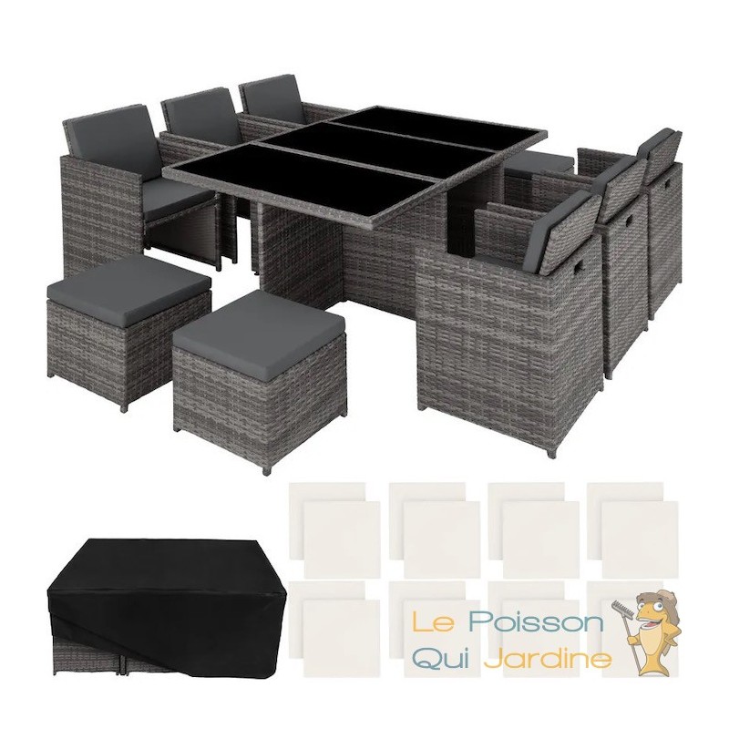 Salon de jardin 10 places avec 2 sets de housses + housse de protection
