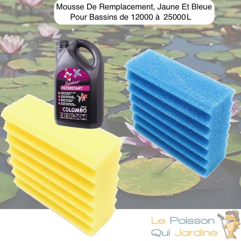 Nous vous proposons deux mousses, 1 jaune et 1 bleue, de filtration de remplacement à placer dans le filtre de bassin de jardin que nous vendons. +bactéries 1000ml