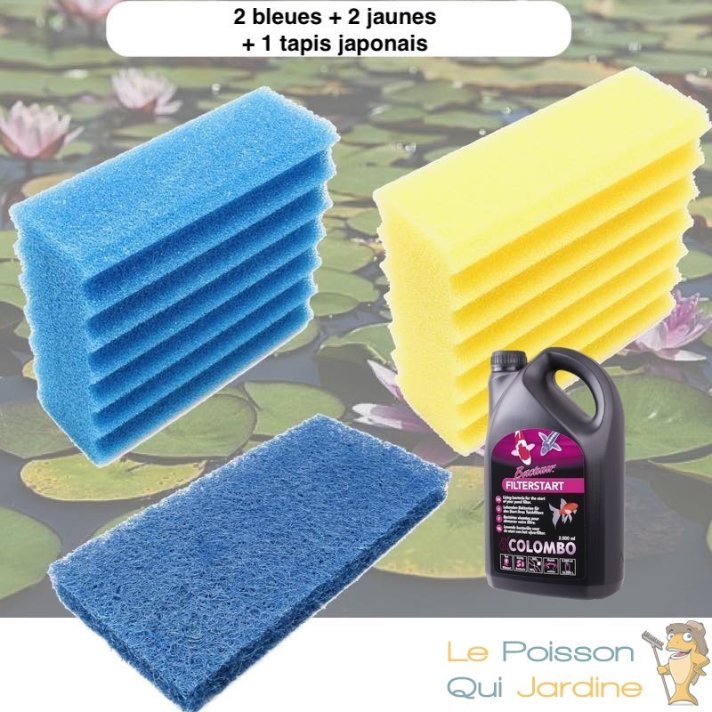Nous vous proposons deux mousses, 2 jaunes et 2 bleues et 1 tapis japonais, de filtration de remplacement à placer dans le filtre de bassin de jardin que nous vendons. + bactéries 1000ml