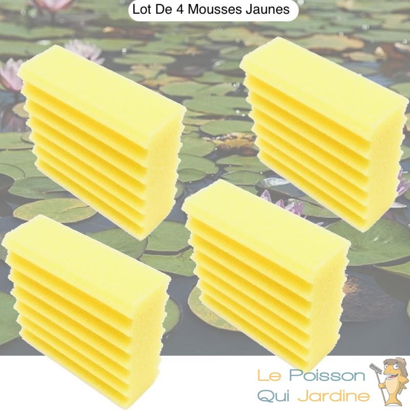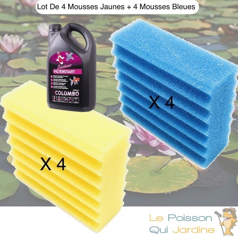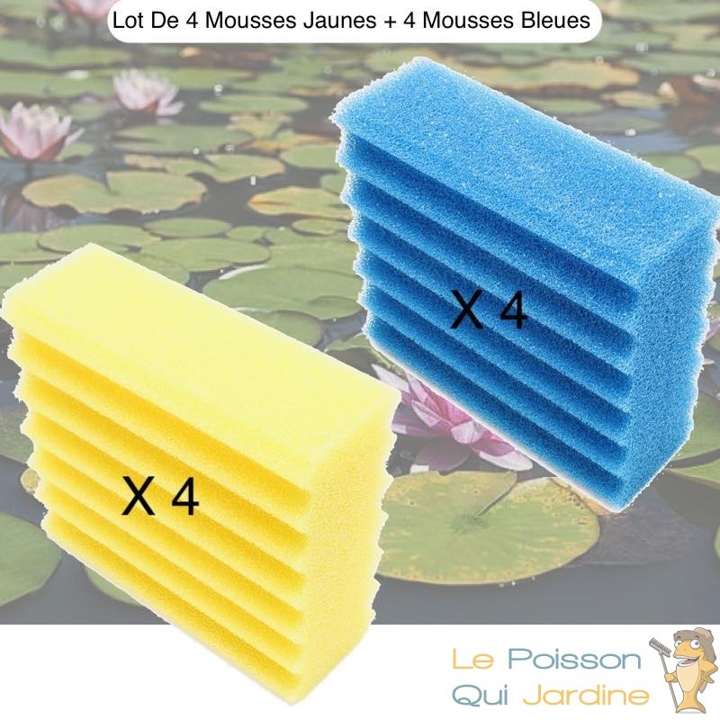 Nous vous proposons 4 mousses bleues et 4 mousses jaunes, de filtration de remplacement à placer dans le filtre de bassin de jardin que nous vendons. + Bactéries 2500 ml