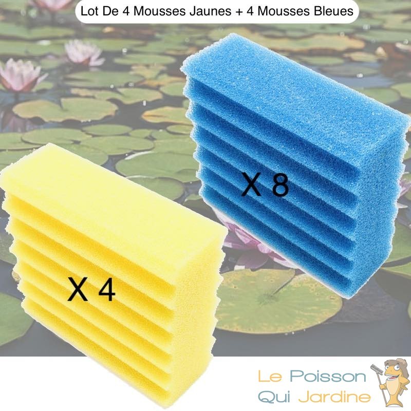 Nous vous proposons 8 mousses bleues et 4 mousses jaunes, de filtration de remplacement à placer dans le filtre de bassin de jardin que nous vendons. + Bactéries 2500 ml