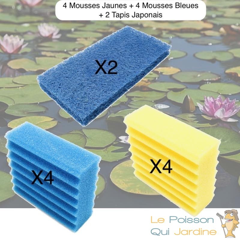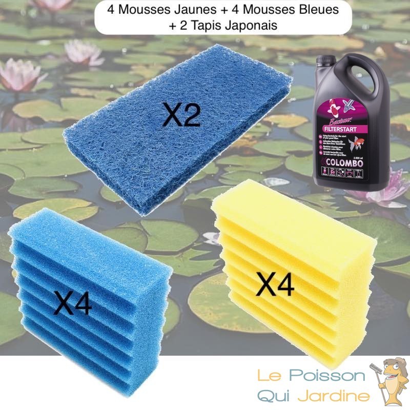 Nous vous proposons quatre mousses jaunes, quatre mousses bleues et deux tapis japonais, de filtration de remplacement à placer dans le filtre de bassin de jardin que nous vendons. + Bactéries 2500 ml