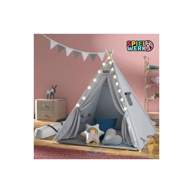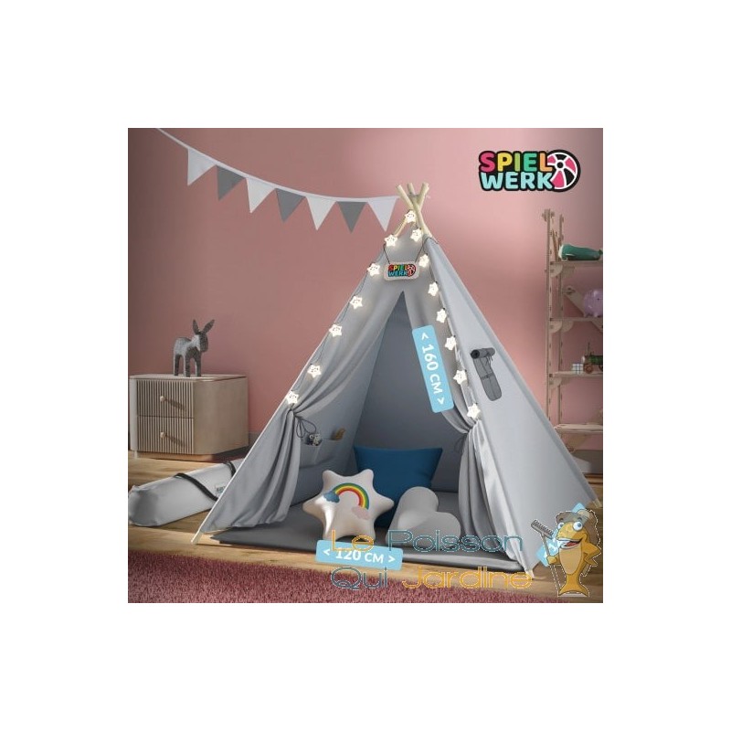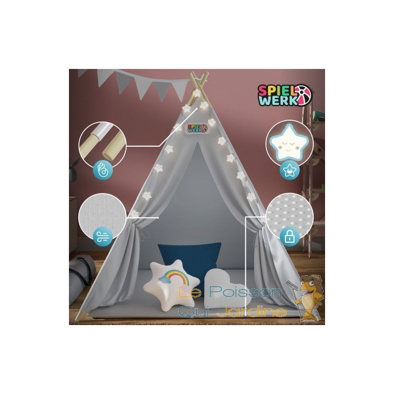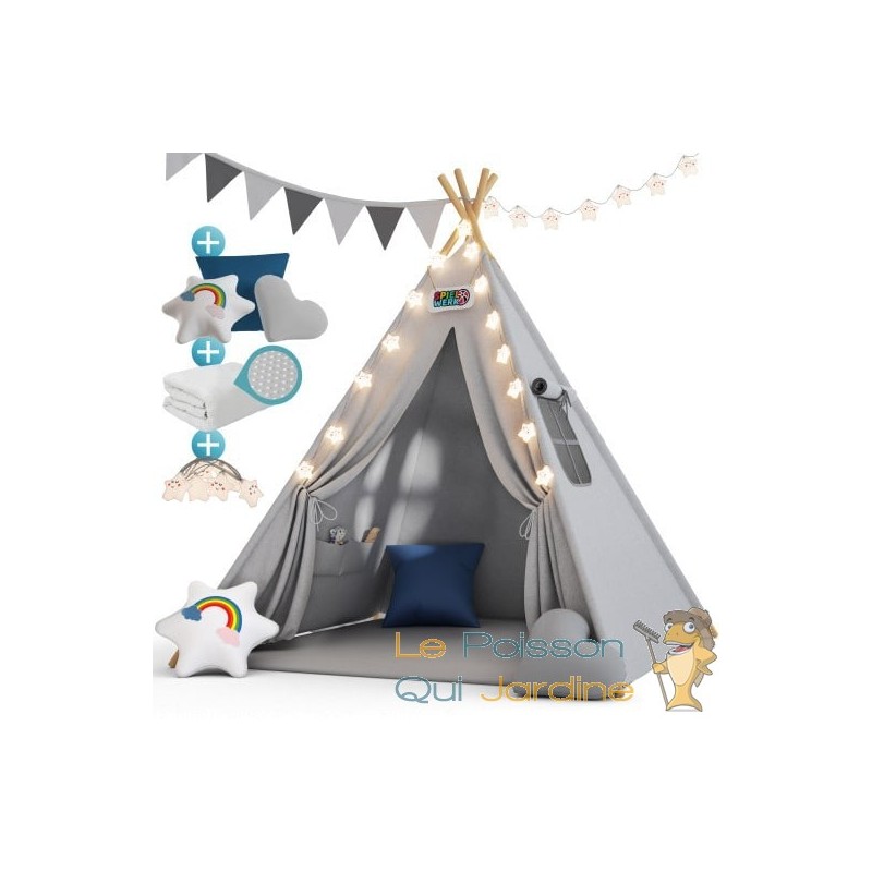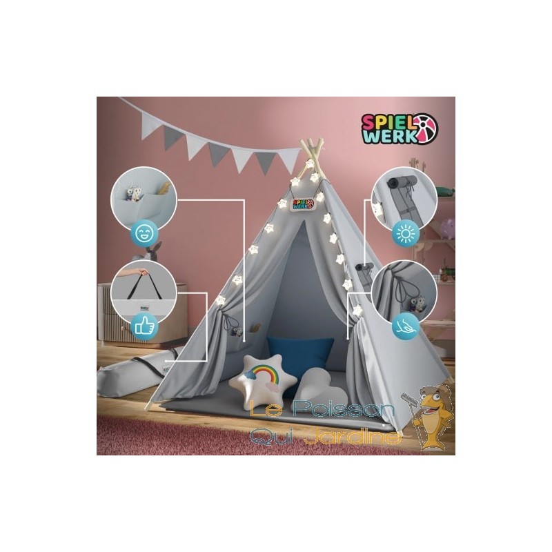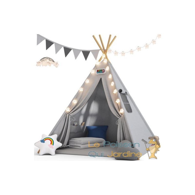 En résumé, le tipi pour enfants est un espace de jeu spacieux et confortable, offrant de nombreuses fonctionnalités et un design sécuritaire. Avec ses détails soignés, son tapis de sol épais, ses coussins assortis, sa guirlande lumineuse et sa construction robuste, il offre aux enfants un endroit magique pour s'amuser et laisser libre cours à leur imagination.
