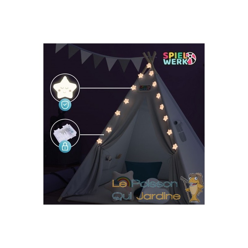 La sécurité est une priorité dans la conception de ce tipi. Les barres en bois de peuplier sont arrondies, minimisant ainsi les risques de blessures. Une barre antidérapante est également présente pour maintenir la stabilité du tipi, même lors des jeux les plus actifs des enfants. Les coins de la guirlande lumineuse sont arrondis pour plus de sécurité. La guirlande lumineuse est équipée de 20 petites lampes LED fonctionnant avec des piles, ajoutant une touche de magie et de luminosité à l'espace de jeu.