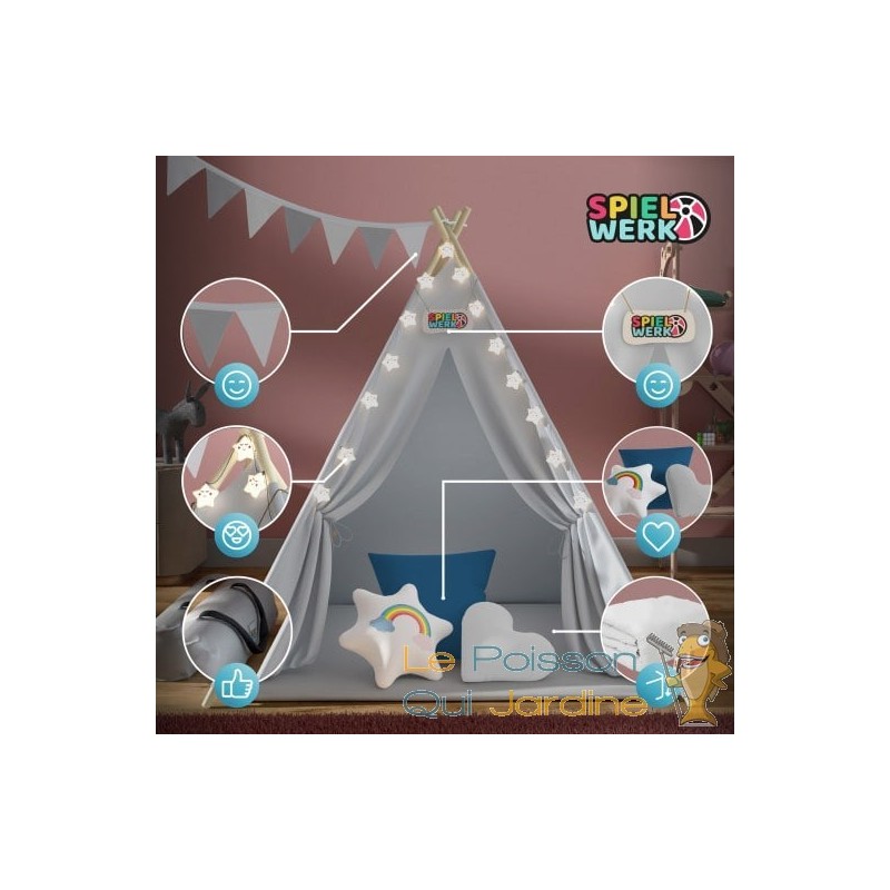 Le tapis de sol de 2,5 cm d'épaisseur procure un grand confort lors des jeux. La guirlande de fanions et la guirlande lumineuse créent une atmosphère douce et chaleureuse, propice à l'exploration et à l'aventure. De plus, trois coussins aux couleurs assorties sont inclus, invitant les enfants à se blottir et à se détendre. Les motifs des coussins, notamment l'étoile avec un arc-en-ciel, le cœur et le coussin carré, attirent tous les regards et ajoutent une touche ludique à l'espace.