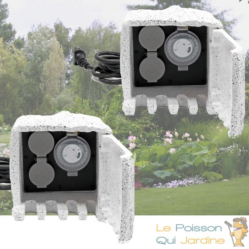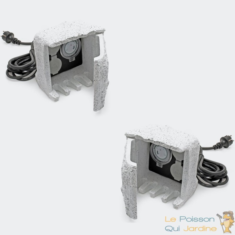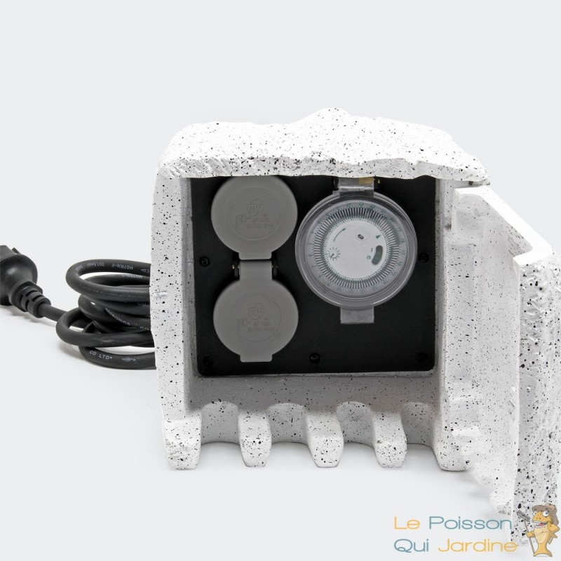 Multiprise étanche pour bassins de jardin et étangs ( 2 prises ) dissimulées dans un coffret imitation pierre ainsi qu'une minuterie.