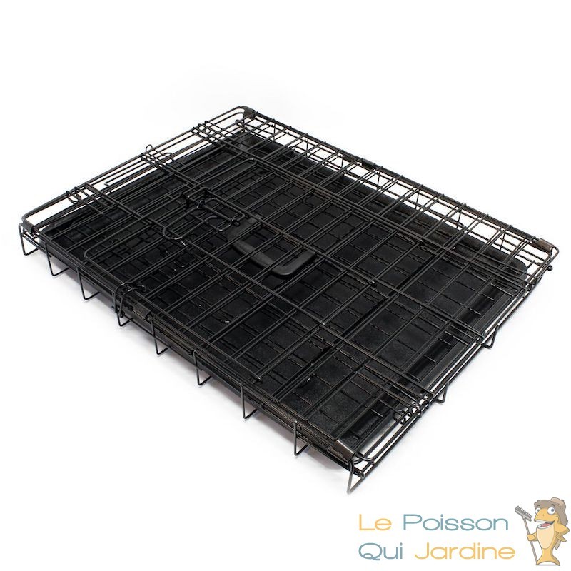 La grille métallique de la cage est solide et elle est équipée de deux portes verrouillables, une à l'avant et une sur le côté. De plus, ce modèle se plie facilement, ce qui facilite son rangement et son transport. Avec sa poignée pratique, vous pouvez la porter aisément. Cette cage en métal est flexible et mobile.