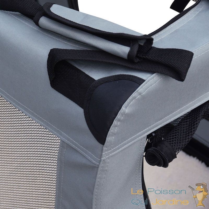 La caisse de transport est fabriquée en polyester gris résistant avec des coins arrondis et un cadre solide en tubes d'acier légers. Son montage est simple et ne nécessite aucun outil, permettant ainsi de le replier rapidement et de le ranger sans effort, de manière peu encombrante.