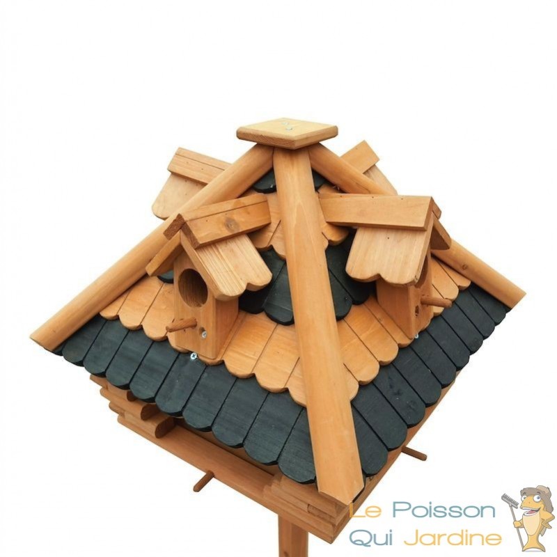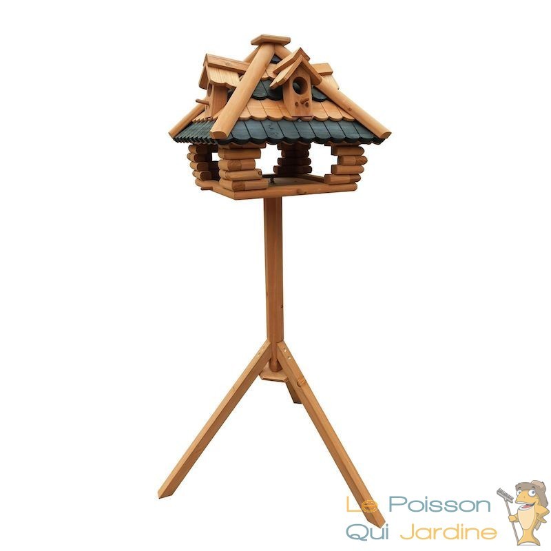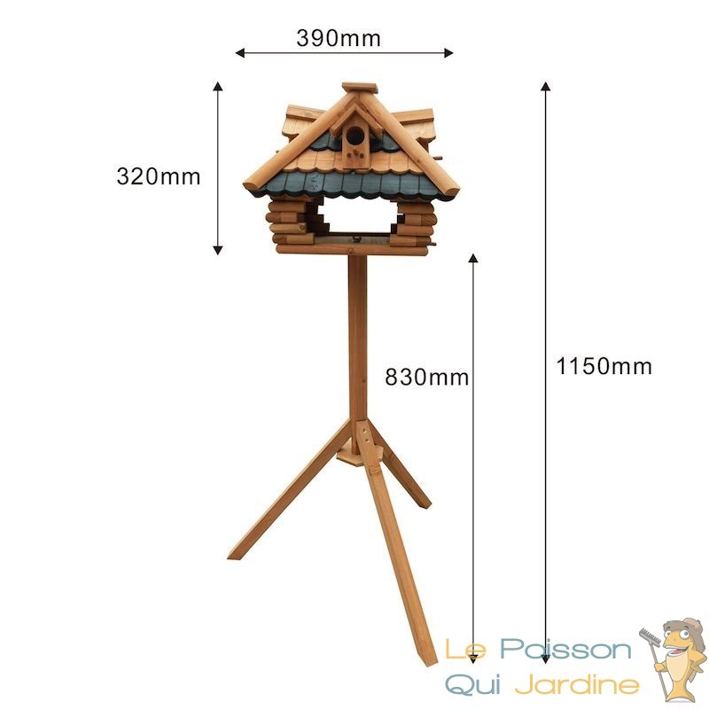 Malgré sa taille, elle ne paraît pas imposante et s'intègre parfaitement à son environnement. Le trépied assure une stabilité optimale, tandis que le support, les pieds et la mangeoire sont en bois de sapin, ce qui leur confère un aspect naturel.