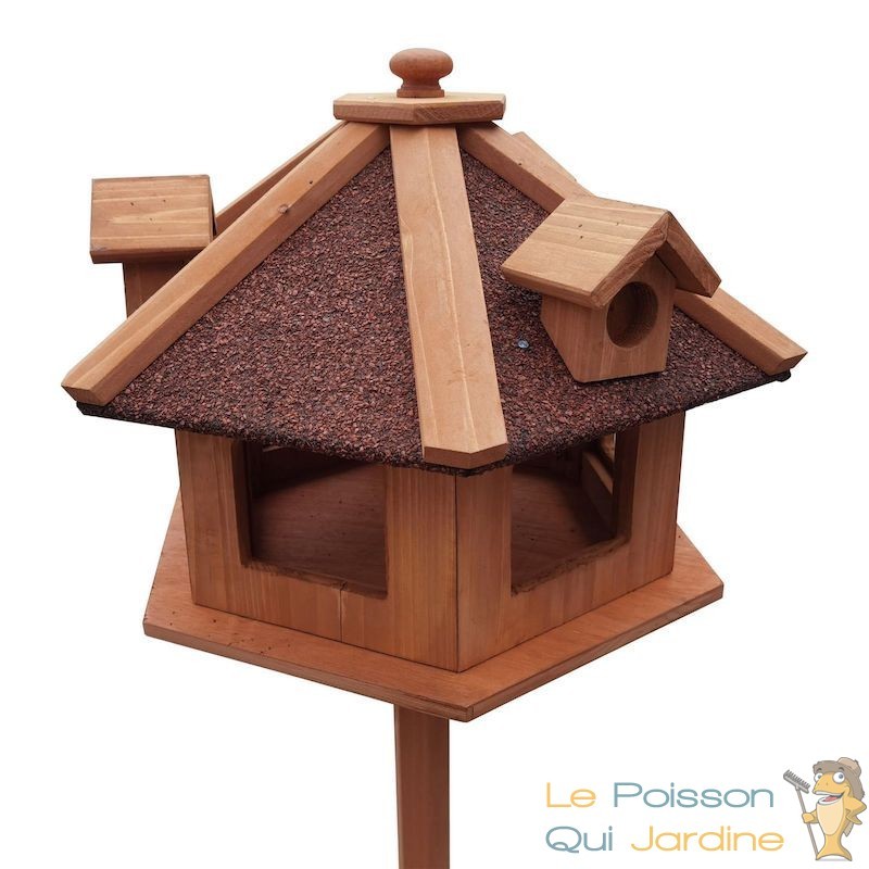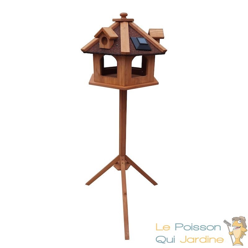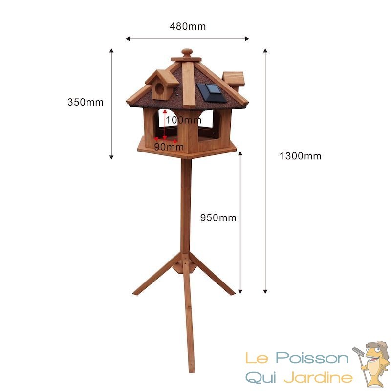 Le trépied assure une stabilité solide, tandis que le support, les pieds et la mangeoire sont fabriqués en bois de sapin, mettant en valeur leur aspect naturel. Pour protéger la nourriture des intempéries, la mangeoire est équipée d'un toit en carton bitumé résistant aux intempéries. Les dimensions totales de la mangeoire (sans le pied) sont de 35 x 48 x 48 cm, ce qui la rend adaptée à différentes espèces d'oiseaux.