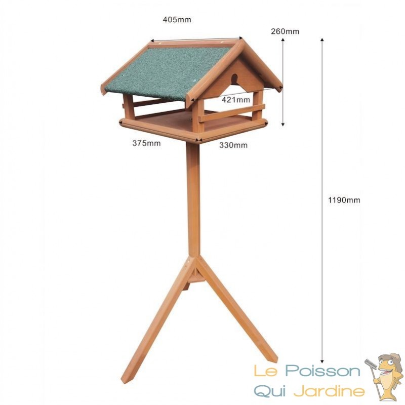 Le trépied offre une stabilité solide. Le support, les pieds et la mangeoire sont en bois, soulignant ainsi leur aspect naturel. Pour protéger la nourriture des intempéries, la mangeoire est équipée d'un toit en bitume résistant aux conditions météorologiques. Les dimensions totales de la mangeoire pour oiseaux sont de 40,5 x 42,1 x 26 cm, ce qui convient à différentes espèces d'oiseaux.