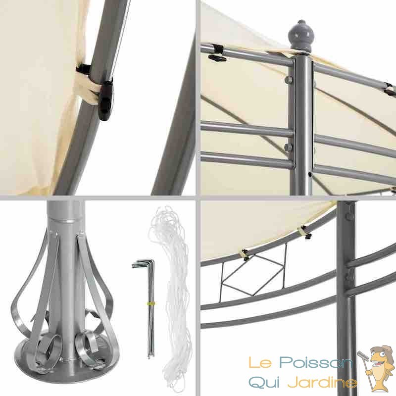 La tonnelle est construite avec des tubes métalliques d'un diamètre de 4 cm, garantissant une haute stabilité et durabilité. Les composants textiles sont en polyester à 100 %, offrant une résistance aux intempéries et une facilité d'entretien. Le métal est revêtu par poudre pour une protection supplémentaire contre la corrosion.