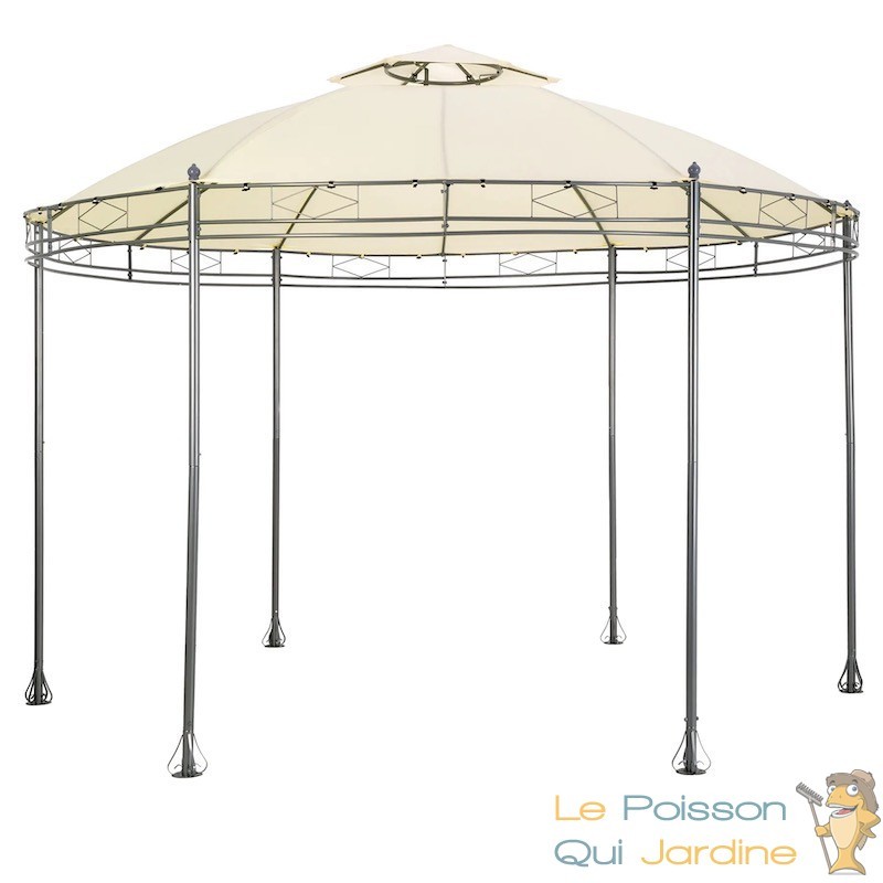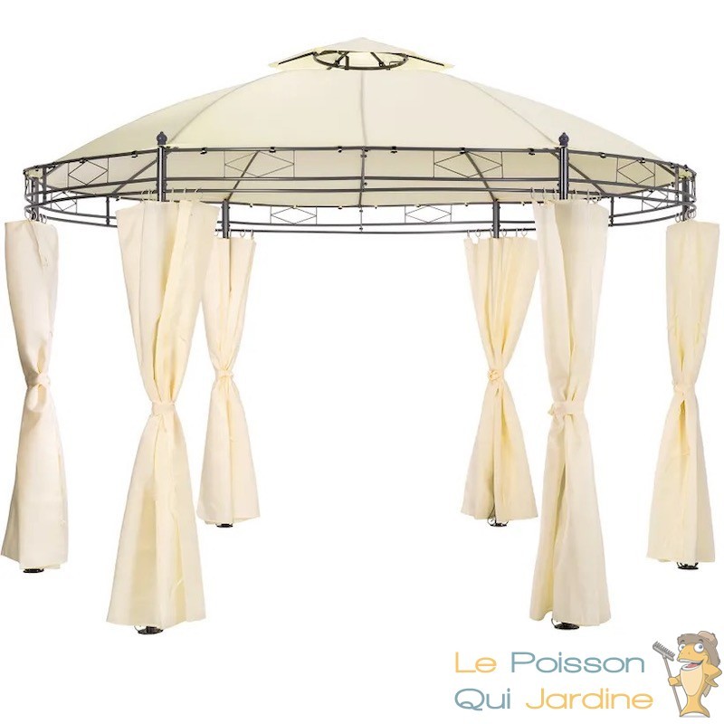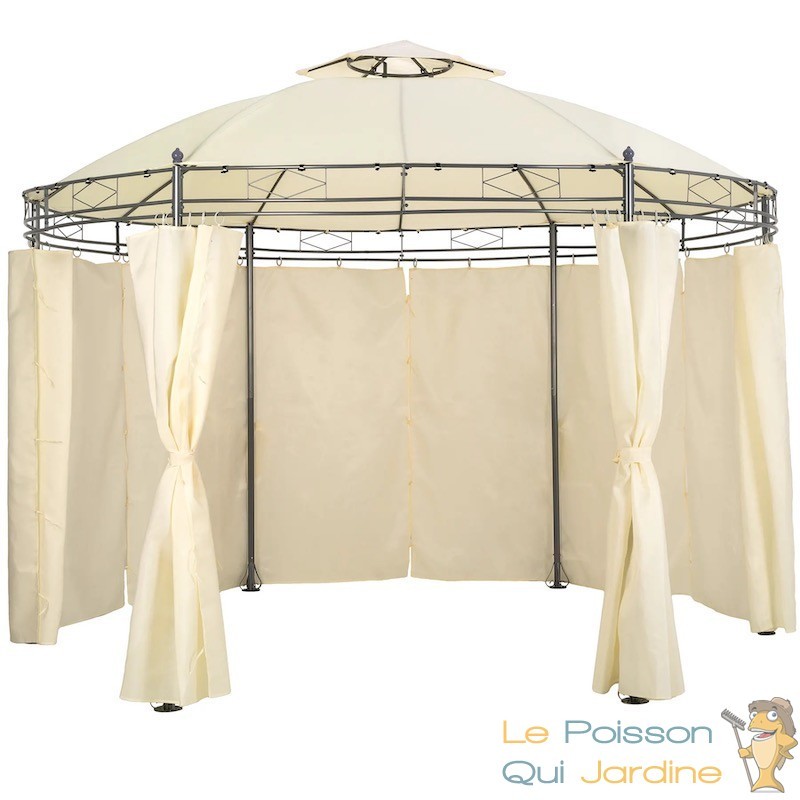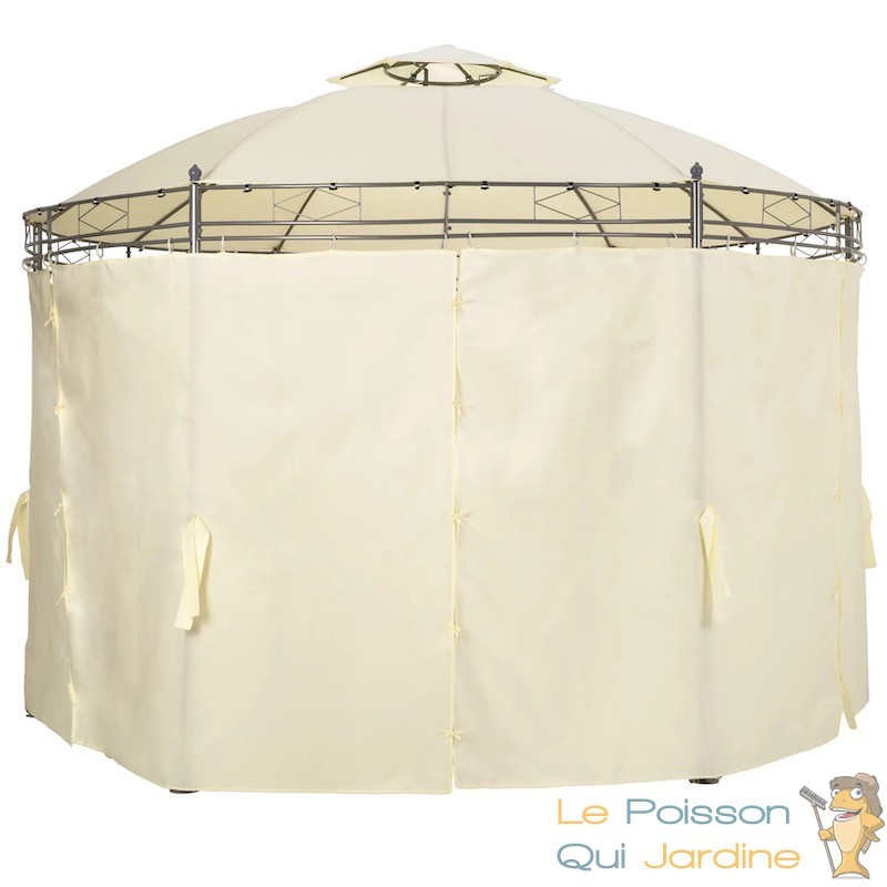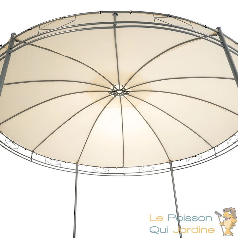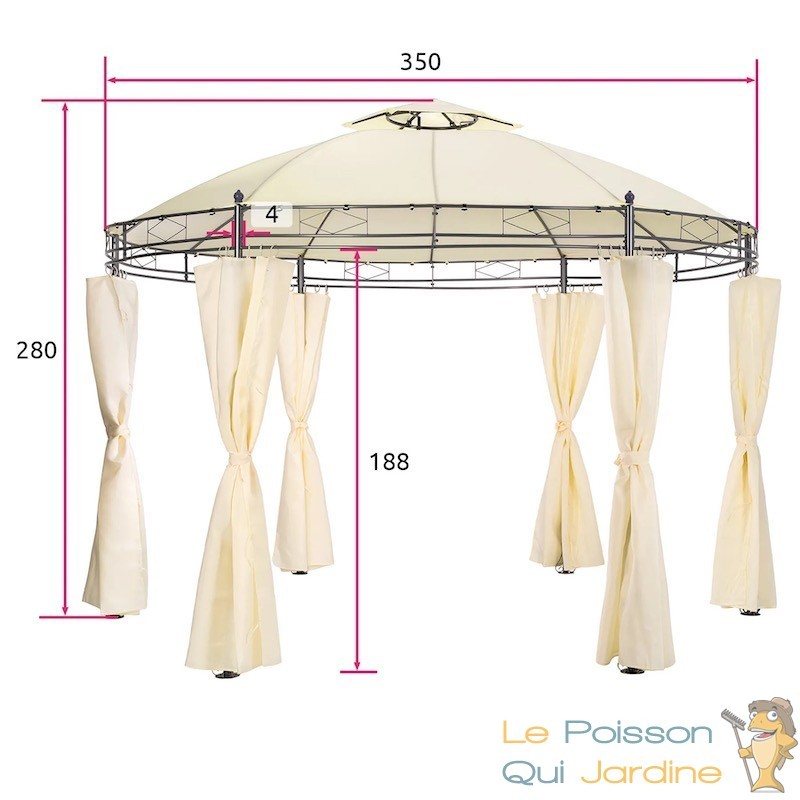 Les dimensions totales de la tonnelle sont d'environ 350 cm de diamètre et 280 cm de hauteur, avec une hauteur des panneaux latéraux d'environ 188 cm. La toile du toit a une épaisseur de 180 g/m², offrant une protection solide contre les rayons du soleil. Les côtés de la tonnelle ont une épaisseur de 140 g/m² pour une bonne résistance aux intempéries.