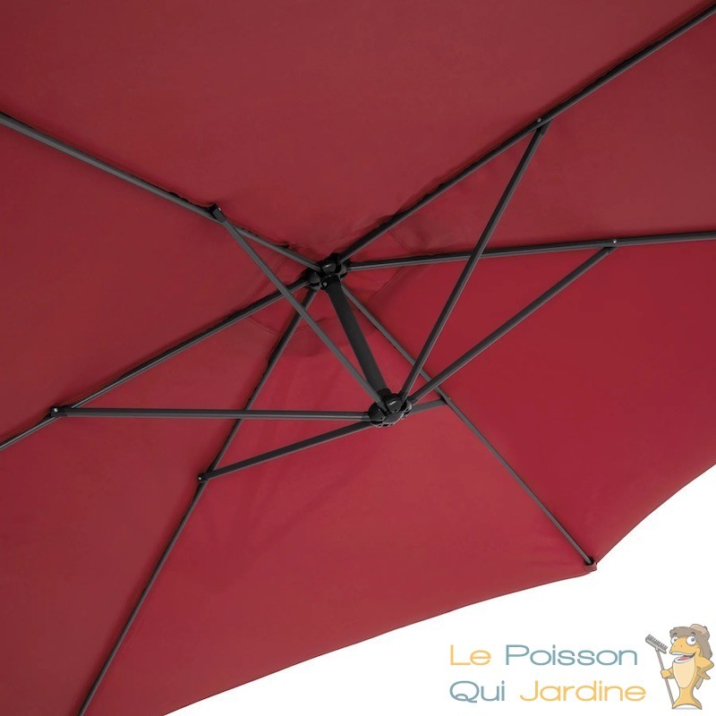 La structure du parasol est de couleur grise, s'intégrant harmonieusement à votre espace extérieur. De plus, des petites ouvertures d'aération placées à 20 cm de la pointe permettent une circulation d'air optimale, empêchant ainsi la formation de chaleur excessive sous le parasol.