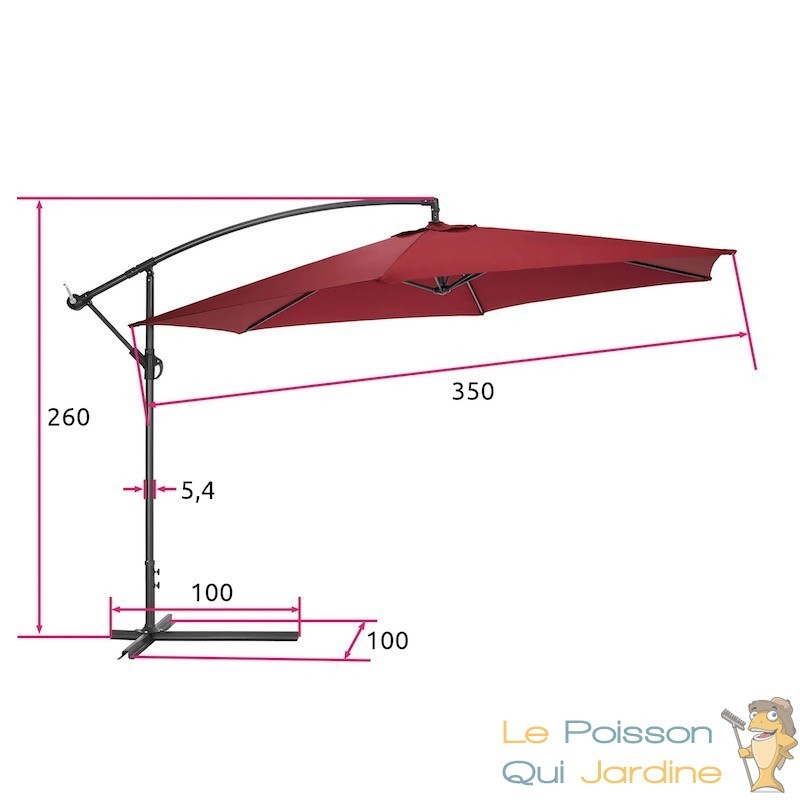 Profitez pleinement de vos journées ensoleillées avec notre parasol excentré de 3,5 m de diamètre, doté d'une protection contre les rayons UV. Avec sa conception pratique et ses fonctionnalités polyvalentes, ce parasol est un choix idéal pour créer un espace ombragé et confortable dans votre jardin ou sur votre terrasse.