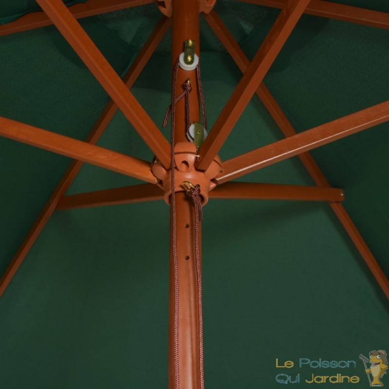 La durabilité est également au rendez-vous grâce à son poteau robuste en bois dur d'une belle couleur de teck et ses 6 nervures solides. Ces caractéristiques ajoutent à sa stabilité et à sa résistance, garantissant que ce parasol restera un élément essentiel de votre espace extérieur pendant de nombreuses années à venir.