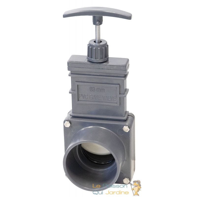 Vanne à guillotine d'un diamètre de 63 mm ( 6,3 cm ) pour tuyauterie ou vidange filtre bassin, trop plein, cuves d'eau de pluie ou encore eau de piscines.
