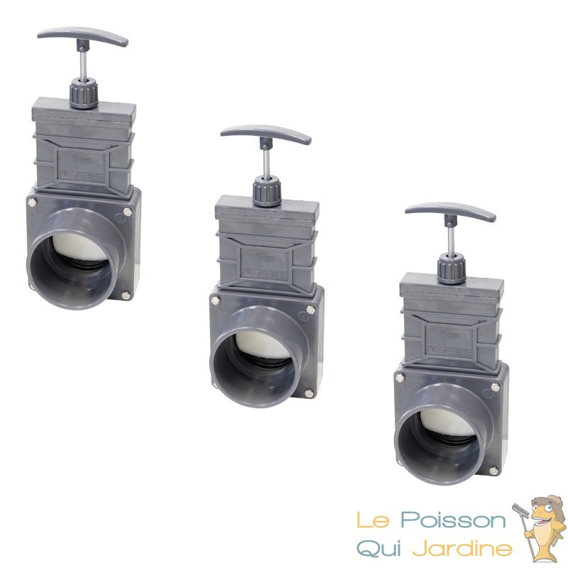 3 Vannes Guillotines d'un diamètre de 75 mm ( 7,5cm ) pour tuyauterie ou vidange filtre bassin, trop plein, cuves d'eau de pluie ou encore eau de piscines.