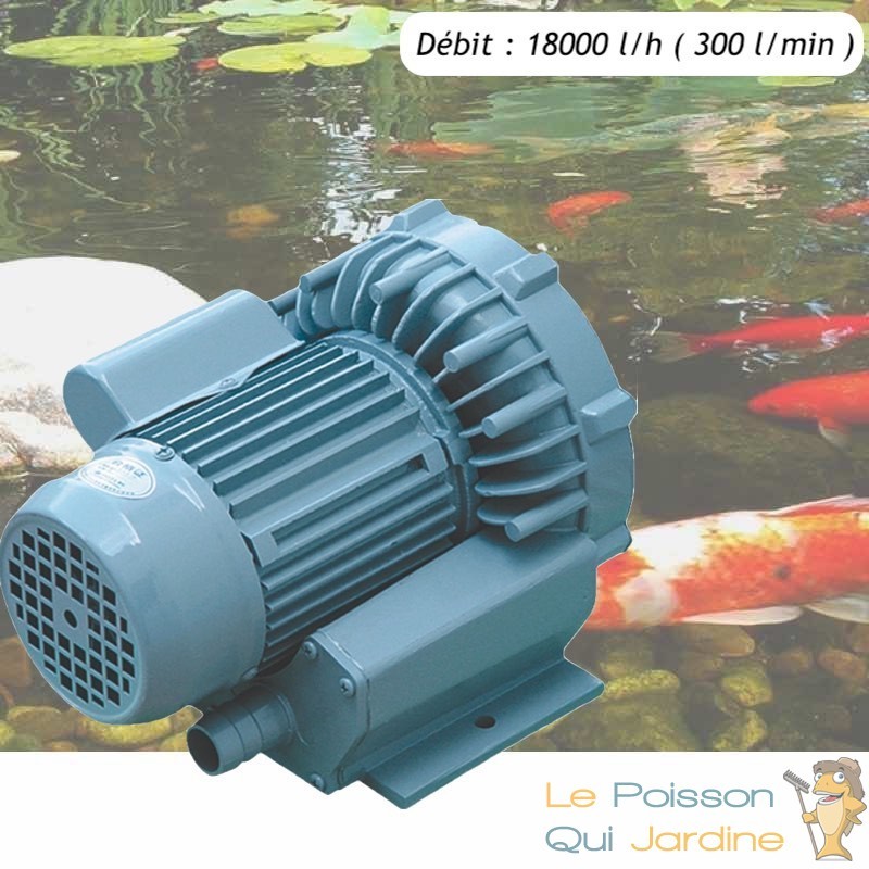 Compresseur aérateur pour bassins de jardin et étangs extérieurs de 20 à 22 m3. Ce compresseur a un débit d'air de 18000 l/h soit 300 litres par minute.