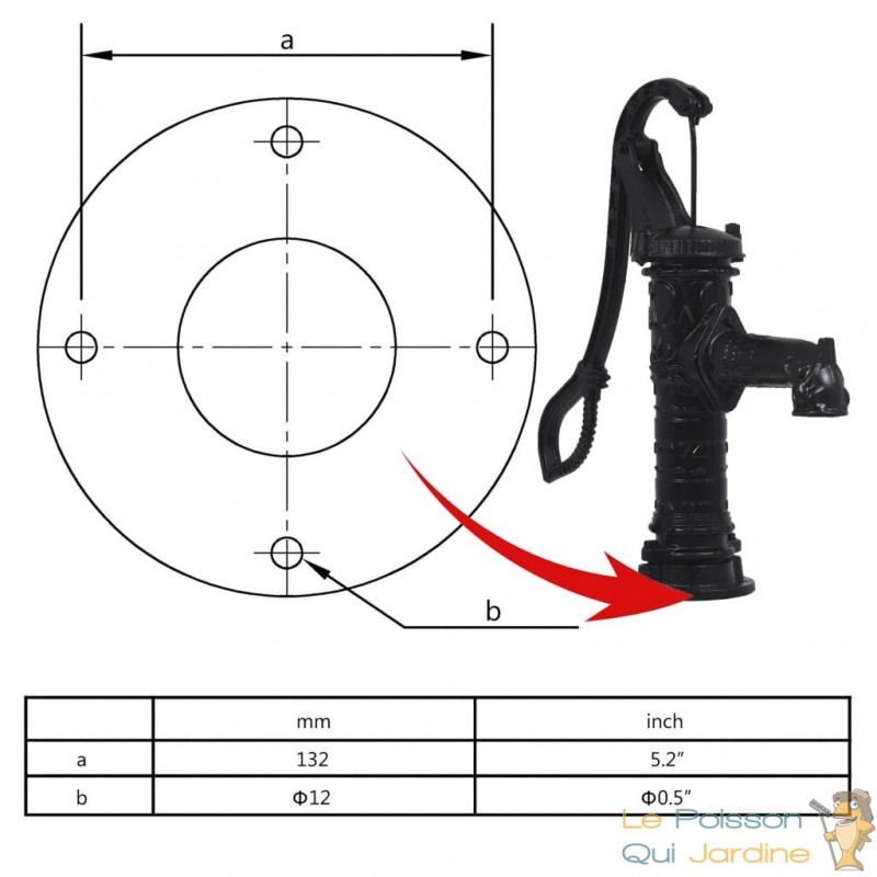 Construite en fonte, elle offre une robustesse exceptionnelle et une durabilité accrue. La pompe est équipée d'un raccord femelle de 38 mm (1 1/2") en bas, auquel un tuyau en PVC ou en acier inoxydable peut être connecté (via un raccord fileté mâle ou un raccord de tuyau) pour diriger l'eau dans la pompe. L'ajout d'un support élève la pompe, offrant ainsi une position de fonctionnement plus ergonomique. Le support est compatible avec la plupart des pompes à main, présentant des trous de montage de 4 x 12 mm à la base. À noter que la pompe et le support peuvent être utilisés de manière indépendante. La livraison inclut uniquement la pompe à eau et le support.