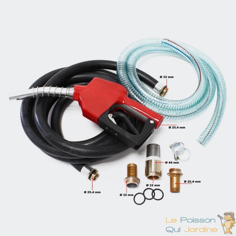 Tout est inclus : Pistolet de distribution du diesel, tuyau d'aspiration, tuyau de pression, accessoires, filtre grossier, compteur de litres et la pompe à gasoil.