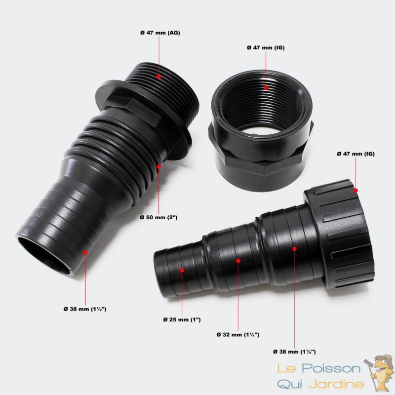 Les raccords pour cette pompes ont les diamètres suivants : 20 - 25 - 32 et 40 mm