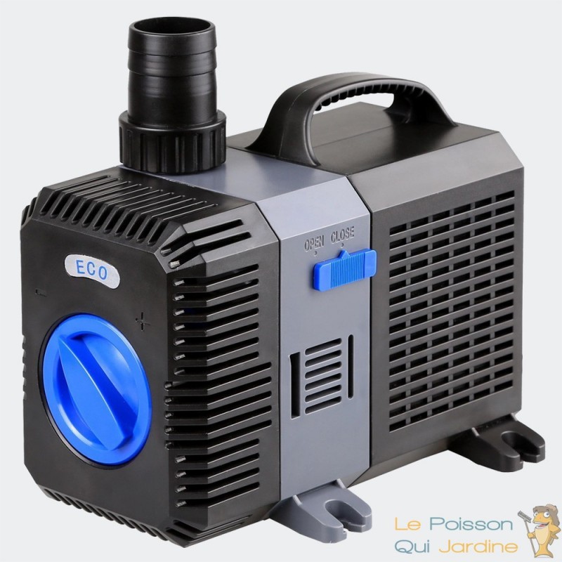 Pompe de bassins de jardin d'un débit d'eau de 8000l/h (8 m3) et d'une remontée d'eau de 560 cm. La puissance électrique n'est que de 70W + 10m de tuyau 32mm.