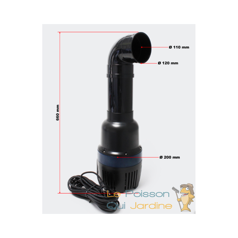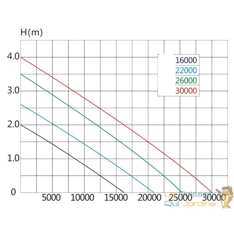 Pompe de bassin de jardin d'un débit d'eau de 30000l/h (30m3) et d'une remontée d'eau de 400 cm. La puissance électrique n'est que de 200W.