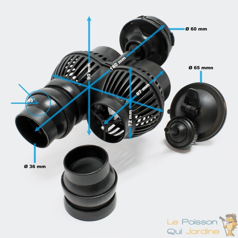 Le design a été conçu pour offrir un flux très large. De plus, la pompe de brassage est complètement orientable. Vu qu'elle est attachée sur sa ventouse ou son aimant par un simple axe, vous pouvez la diriger dans tous les sens et ce, sur 180°.