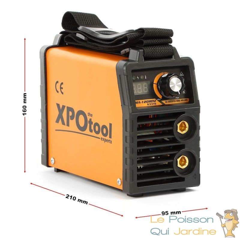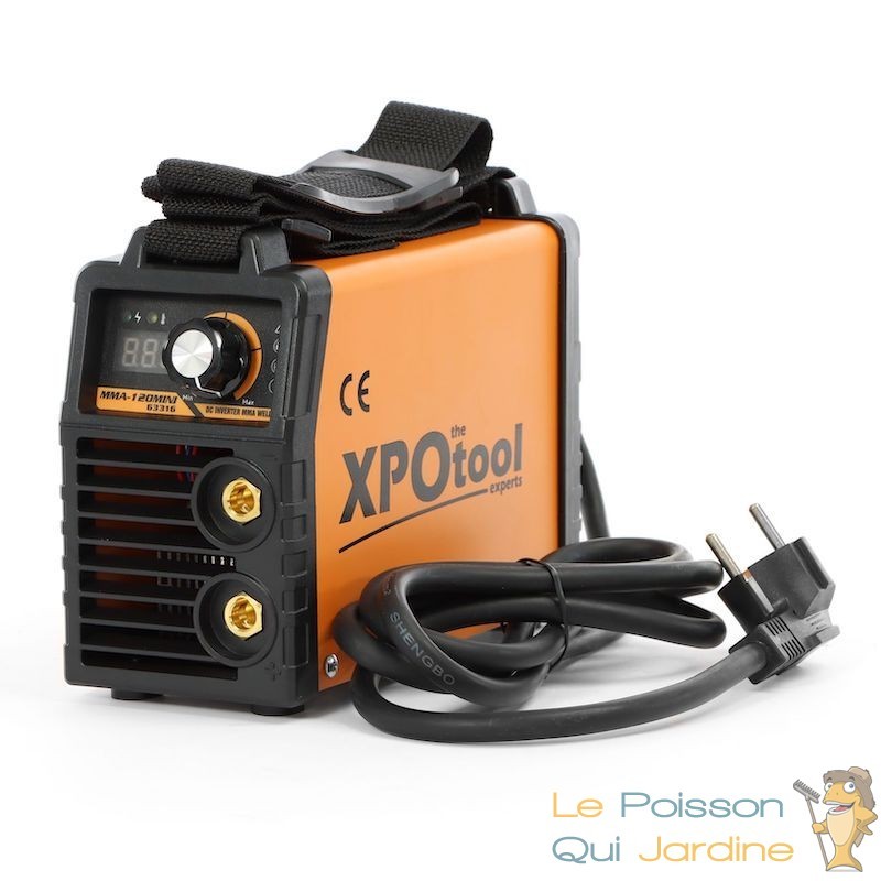 L'appareil est alimenté par une tension de 220-240V et offre une plage de courant de soudage réglable de 20 à 120 ampères. Il convient pour une utilisation avec des électrodes de 1,6 à 3,2 mm d'épaisseur, ce qui permet de souder des tôles d'épaisseur allant de 1,5 à 3 mm.