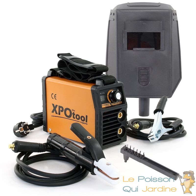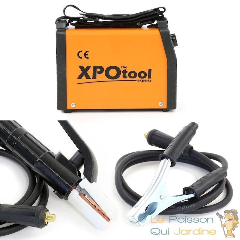 Les accessoires inclus dans la livraison comprennent un pistolet de soudage MMA avec un câble de 2 mètres de long, un câble de masse avec une borne de 1,5 mètre de long, un écran de soudage pour protéger vos yeux des rayons UV, ainsi qu'une brosse métallique avec un marteau à scories pour le traitement ultérieur des soudures.