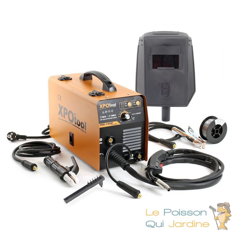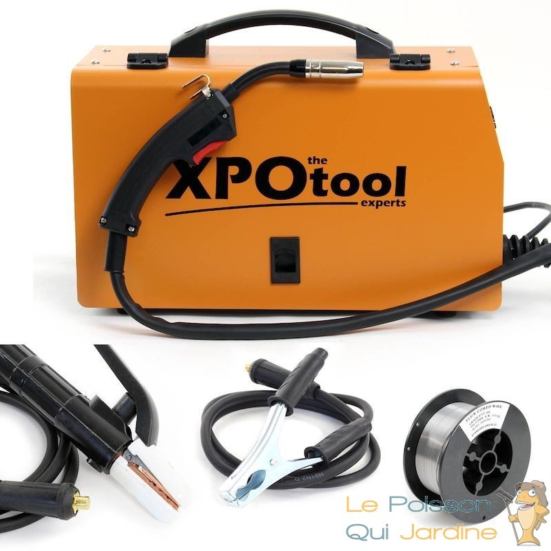 Les accessoires inclus sont une torche de soudage, une pince porte-électrode, une pince de masse avec câble, un rouleau de fil fourré (0,8 mm), un écran de soudage et une brosse métallique avec marteau à scories.