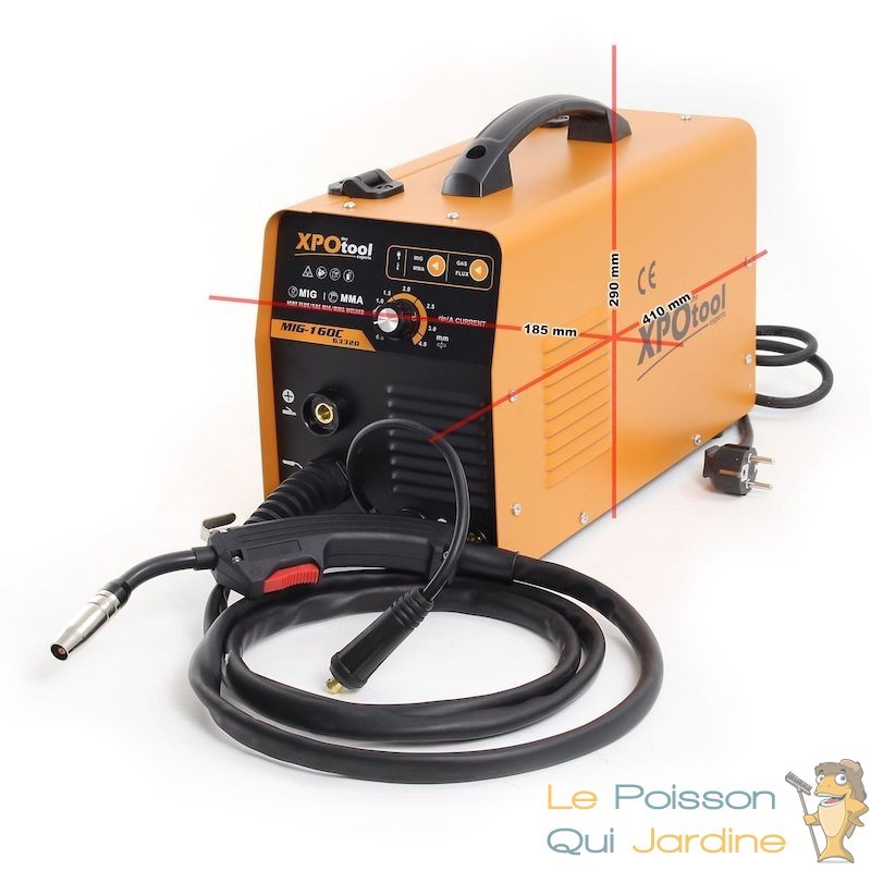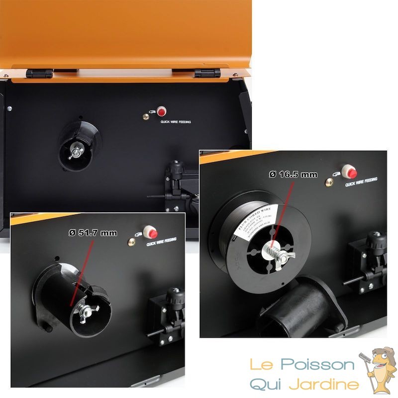 Le choix du procédé de soudage dépend principalement du matériau et de l'épaisseur de la tôle (0,5-5 mm). Le poste de soudage est équipé d'un régulateur rotatif pratique pour ajuster le courant de soudage correspondant. Le dévidoir est conçu pour être utilisé avec un fil de soudage et un fil fourré d'une épaisseur de 0,8 à 0,9 mm (0,5-5 kg).