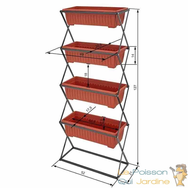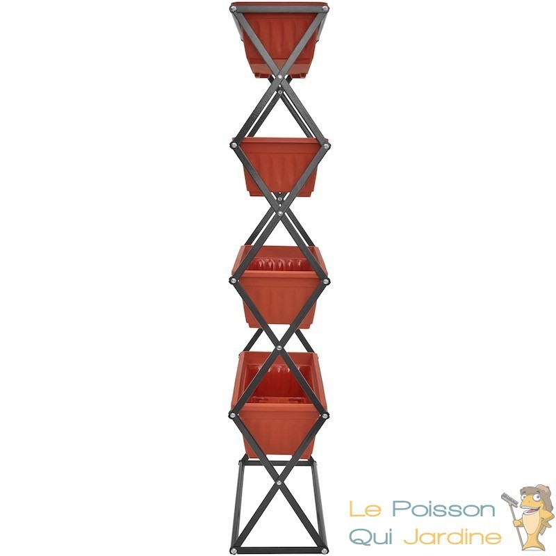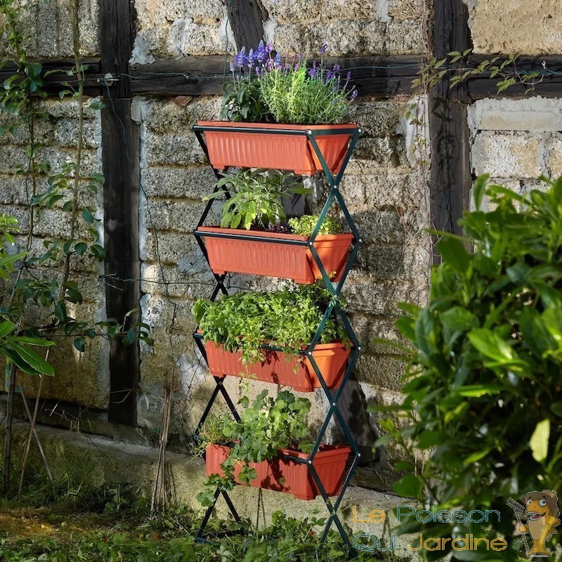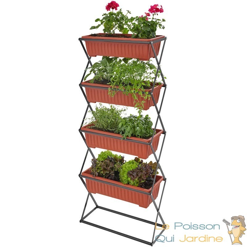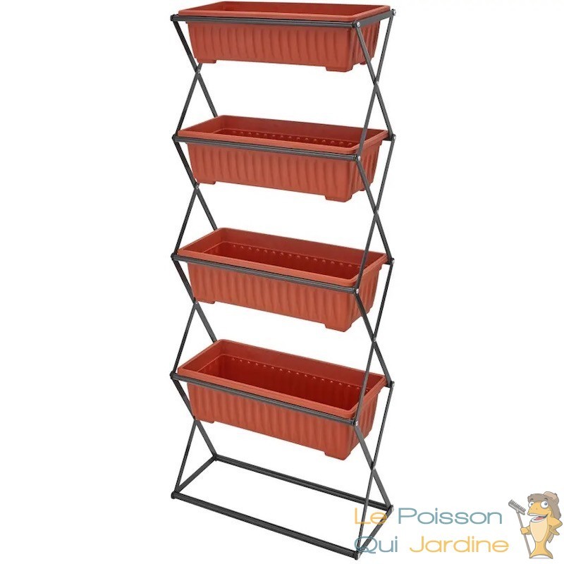 Découvrez notre jardinière verticale compacte qui offre quatre bacs à fleurs.