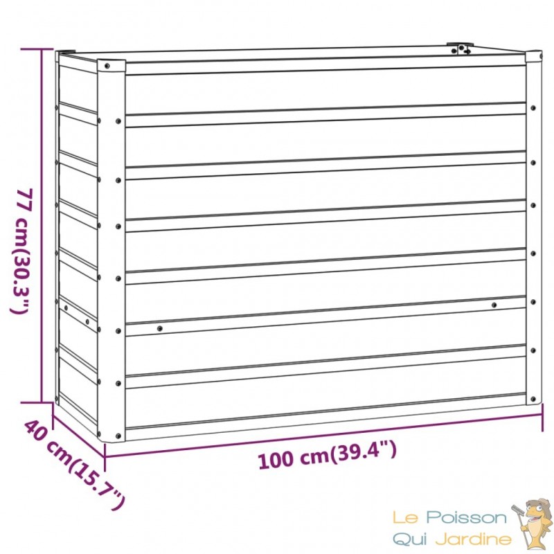Cette jardinière se distingue non seulement par sa robustesse et sa fonctionnalité, mais aussi par son esthétique unique. Son aspect en relief, évoquant de longues lames de métal superposées, offre un effet moderne et métallique qui attire immédiatement l'œil. Cet aspect remarquable lui permet de se fondre harmonieusement dans divers environnements extérieurs, qu'il s'agisse d'un jardin verdoyant, d'une terrasse contemporaine ou d'un balcon urbain.