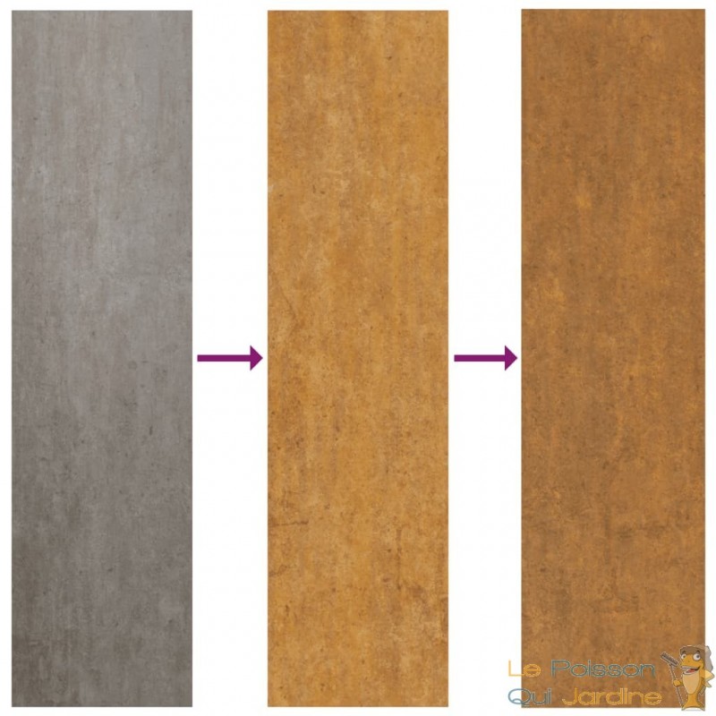 Lors de la réception du produit, celui-ci arbore une couleur métallique normale, sans trace de rouille. Avec le temps, la jardinière développera une patine de rouille, lui conférant un caractère unique. Pour accélérer ce processus, l'application d'eau savonneuse et salée sur la surface peut être effectuée.