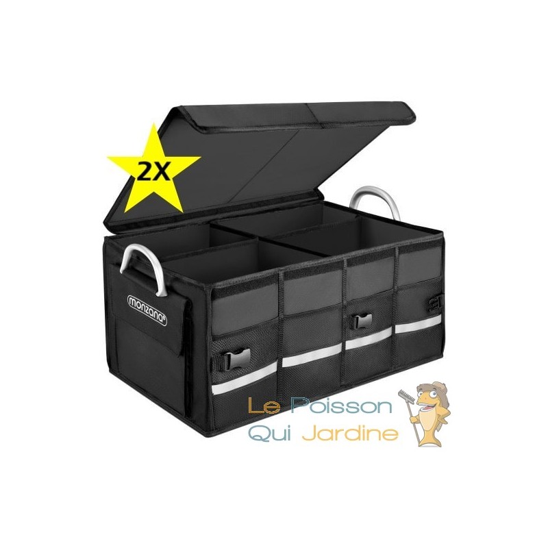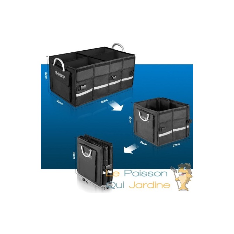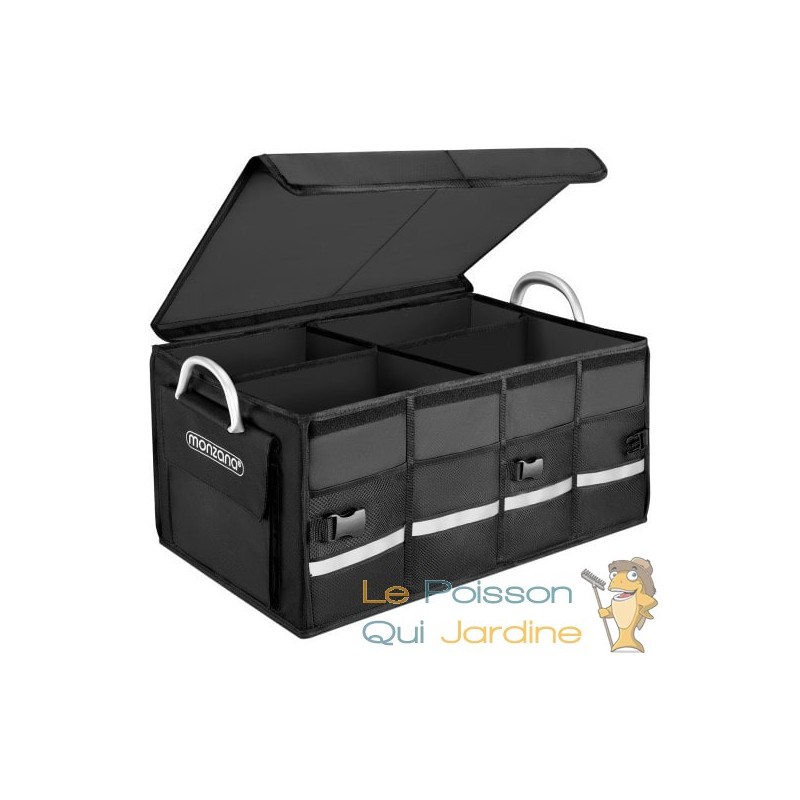 Cet organisateur de coffre est entièrement adaptable grâce à ses deux séparateurs internes et son couvercle amovible. Vous pouvez le réduire de moitié ou le plier entièrement en un clin d'œil grâce aux fermetures à clic.