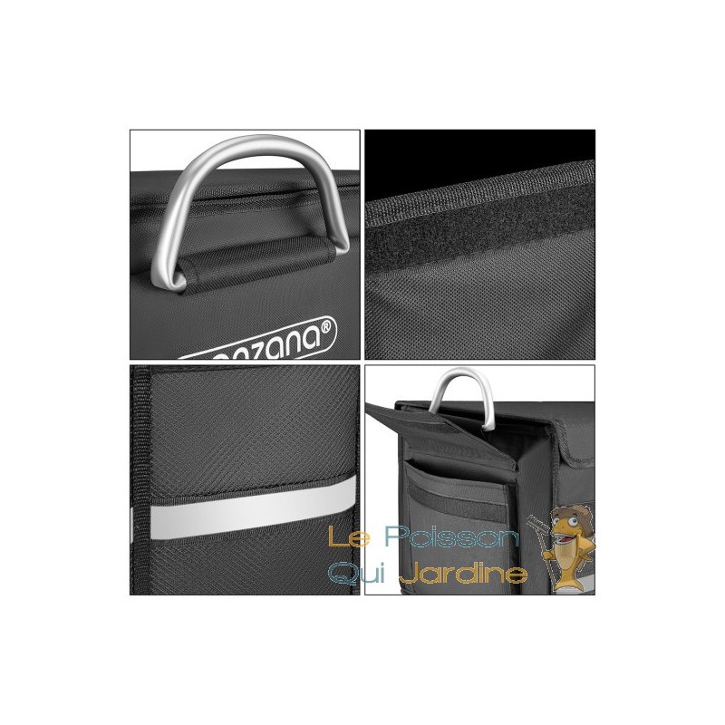 Le sac est facile à transporter grâce à ses deux poignées en aluminium. Des bandes réfléchissantes le rendent plus visible dans l'obscurité.